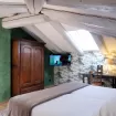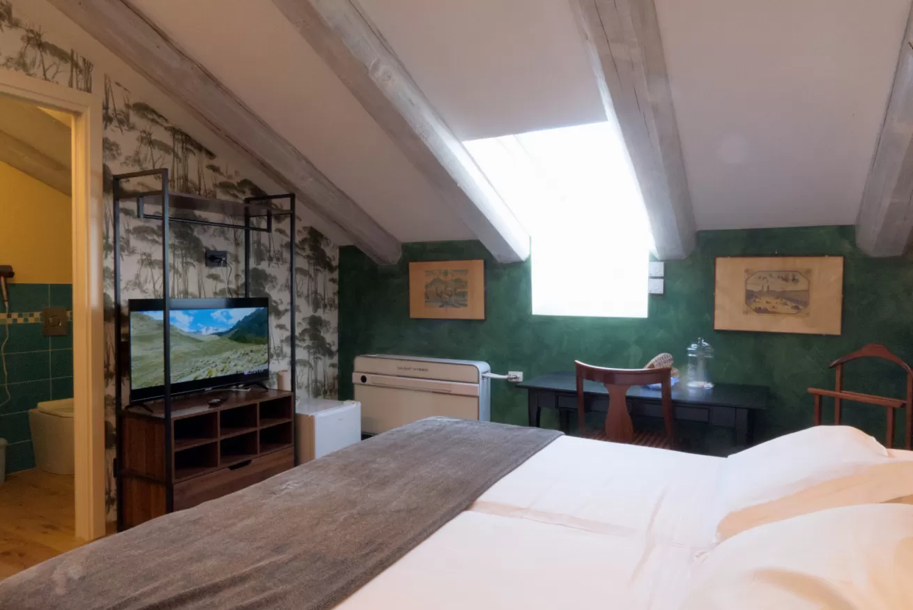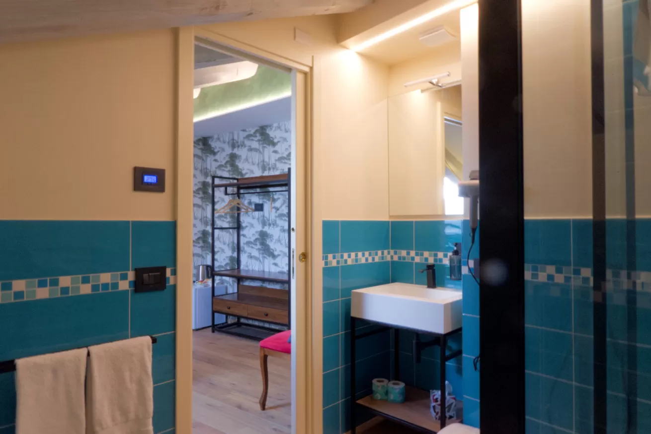 Queste camere hanno solo finestre Velux, dotate di pannelli oscuranti, che evitano che la luce dell'alba possa svegliare coloro che hanno un sonno più leggero. Coloro che amano addormentarsi sotto la luce delle stelle e un risveglio con la luce naturale dell'alba potranno evitare di attivare il pannello oscurante. Il bagno dispone di ampio piatto doccia, toilette, bidè e asciugacapelli.